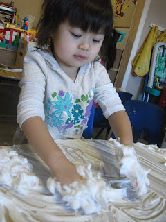 Shaving cream used as snow. The most fun and messy thing you can do for a dollar. We made roads and drove the cars through the snow. The shaving cream cleaned the table and the room smelt so good the rest of the day.
